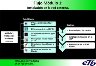 El documento describe el Módulo 1 sobre la instalación en la red externa. El módulo cubre temas como el lanzamiento de cables, la instalación de cables en la NAP aérea e instalación en la NAP sótano, incluyendo cómo armar un Punto Terminal Óptico.