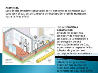 Este documento describe los requisitos técnicos y de seguridad para las instalaciones de gas, incluyendo la acometida desde la red de distribución, la ejecución de la instalación interior, la instalación de artefactos a gas, los medidores de gas, y la evacuación de gases de combustión. También cubre el almacenamiento y transporte de gas y define la simbología según la normativa aplicable.