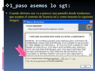 El documento proporciona instrucciones para instalar VMware Workstation y crear una máquina virtual. Explica los 13 pasos para aceptar el contrato de licencia, seleccionar una configuración típica, asignar un nombre y ubicación a la máquina virtual, configurar la conectividad de red, asignar el espacio en disco, e iniciar la instalación del sistema operativo seleccionado en la máquina virtual.