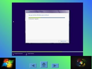 Este documento resume los pasos para instalar Windows 8. Describe que la instalación es sencilla con un asistente que guía el proceso paso a paso, incluyendo seleccionar el idioma, particionar el disco, ingresar la licencia, y crear una cuenta de usuario o iniciar sesión. Una vez completada la instalación, el sistema inicia en la interfaz Metro de Windows 8.