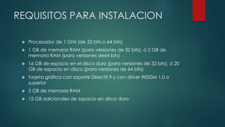 El documento describe los requisitos y pasos para instalar Windows. Los requisitos incluyen un procesador de 1 GHz, 1-2 GB de RAM, 16-20 GB de espacio en disco dependiendo de si es de 32 o 64 bits. Los pasos son entrar al menú de arranque, seleccionar CDROM, configurar idioma y zona horaria, hacer clic en instalar, buscar actualizaciones e ingresar la clave de Windows.