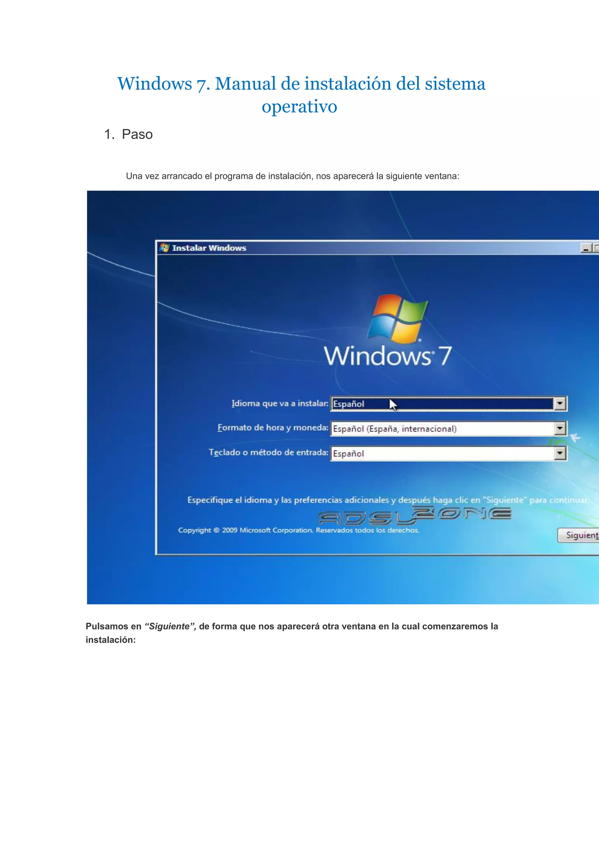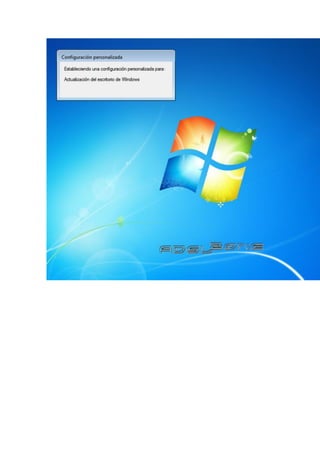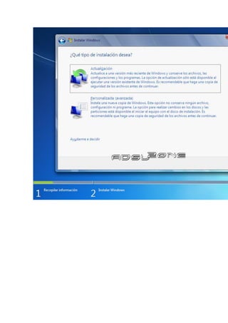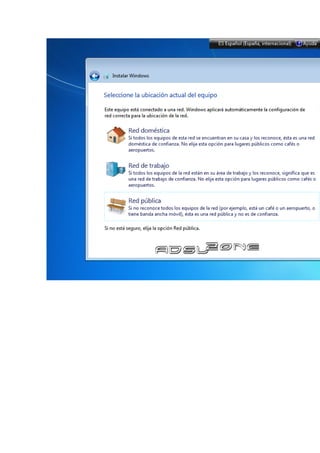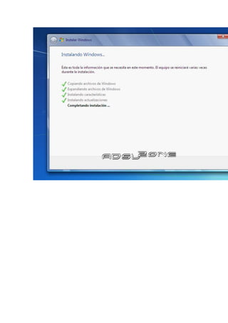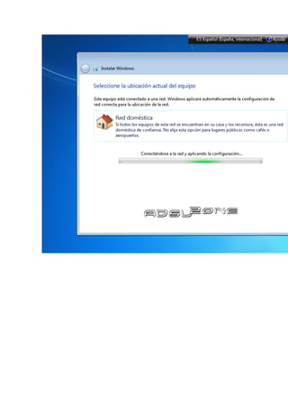 El documento proporciona instrucciones para instalar Windows 7. Explica los pasos de instalación, incluyendo aceptar los términos de licencia, particionar el disco duro, formatear las particiones, instalar Windows 7, configurar la cuenta de usuario, activar Windows y configurar la red.