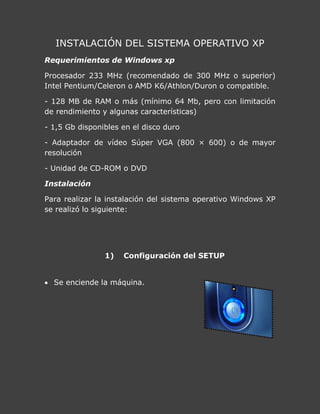 Este documento proporciona instrucciones paso a paso para instalar Windows XP. Explica los requisitos del sistema, como configurar el orden de arranque en la BIOS para iniciar desde el CD de instalación, eliminar particiones existentes en el disco duro, crear nuevas particiones siguiendo las instrucciones en pantalla, e instalar Windows XP seleccionando la partición de instalación.