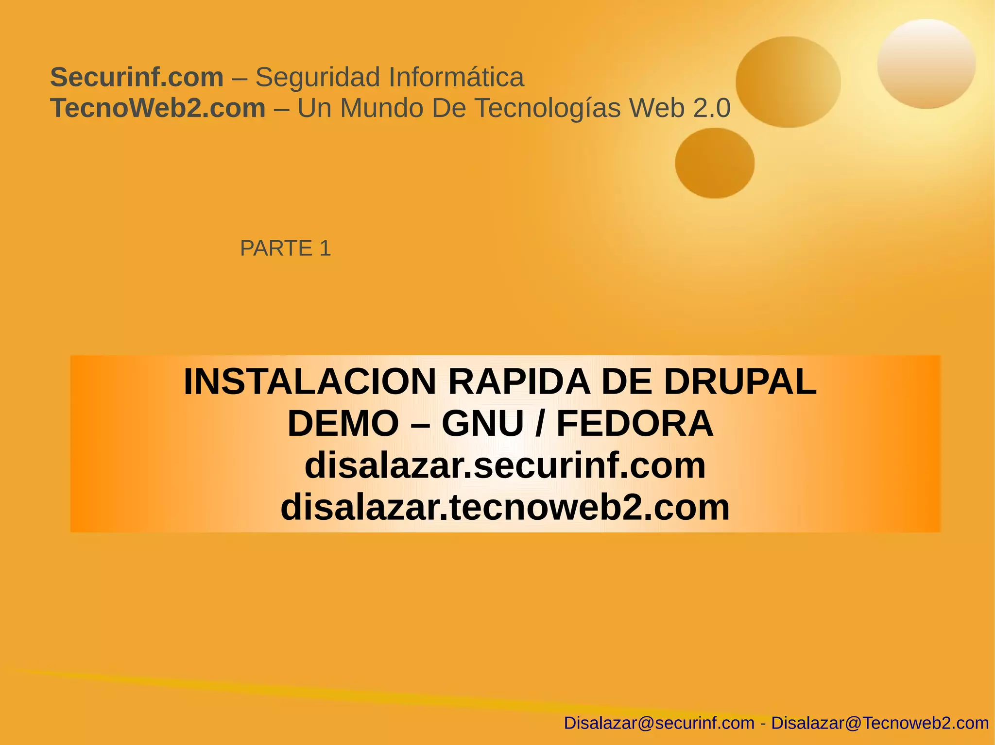 Este documento proporciona instrucciones para instalar Drupal de forma rápida en Fedora. Explica cómo descargar Drupal de la página oficial, descomprimir el archivo en el directorio web, iniciar los servicios HTTP y MySQL, y completar la instalación ingresando a la dirección URL local. También cubre cómo traducir Drupal al español descargando el archivo de traducción correspondiente.