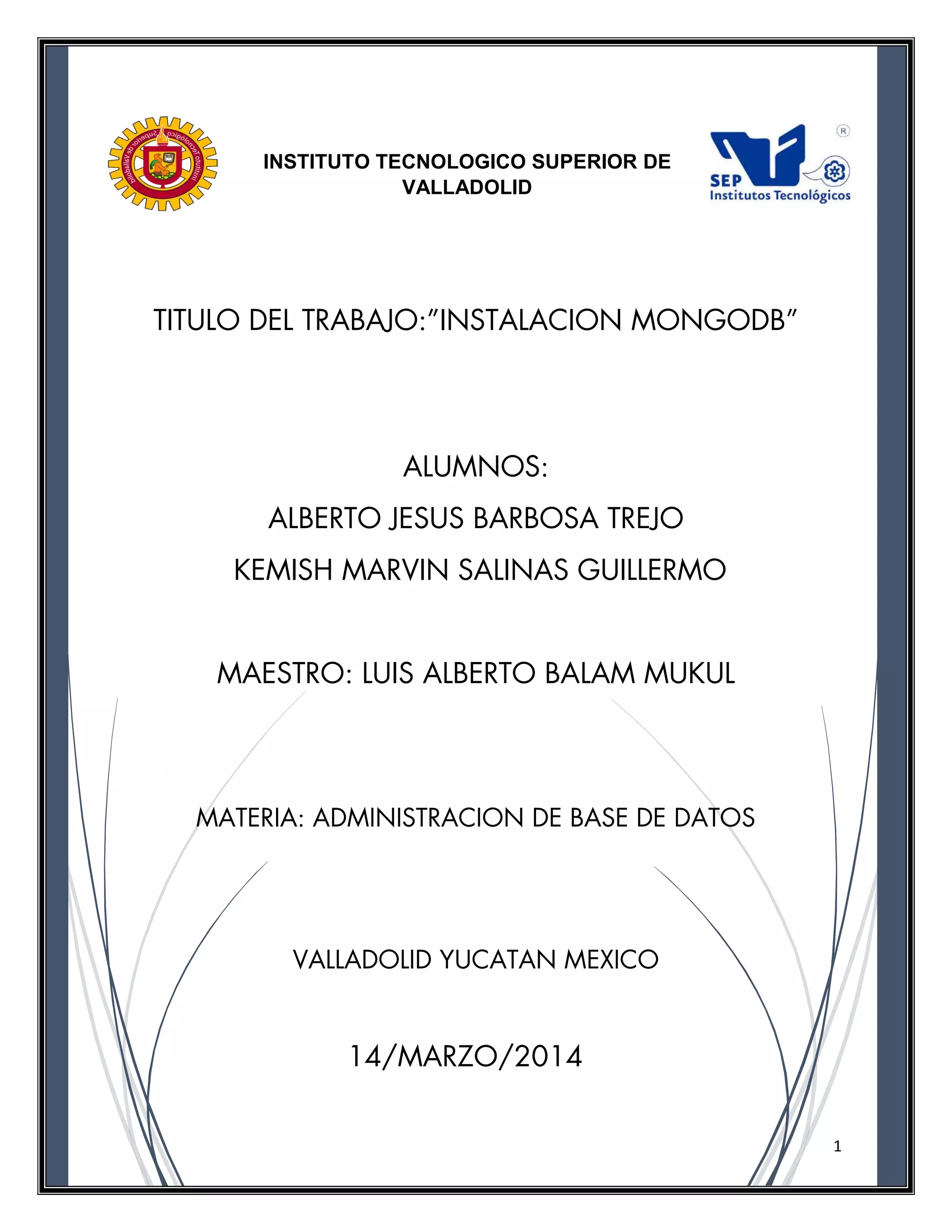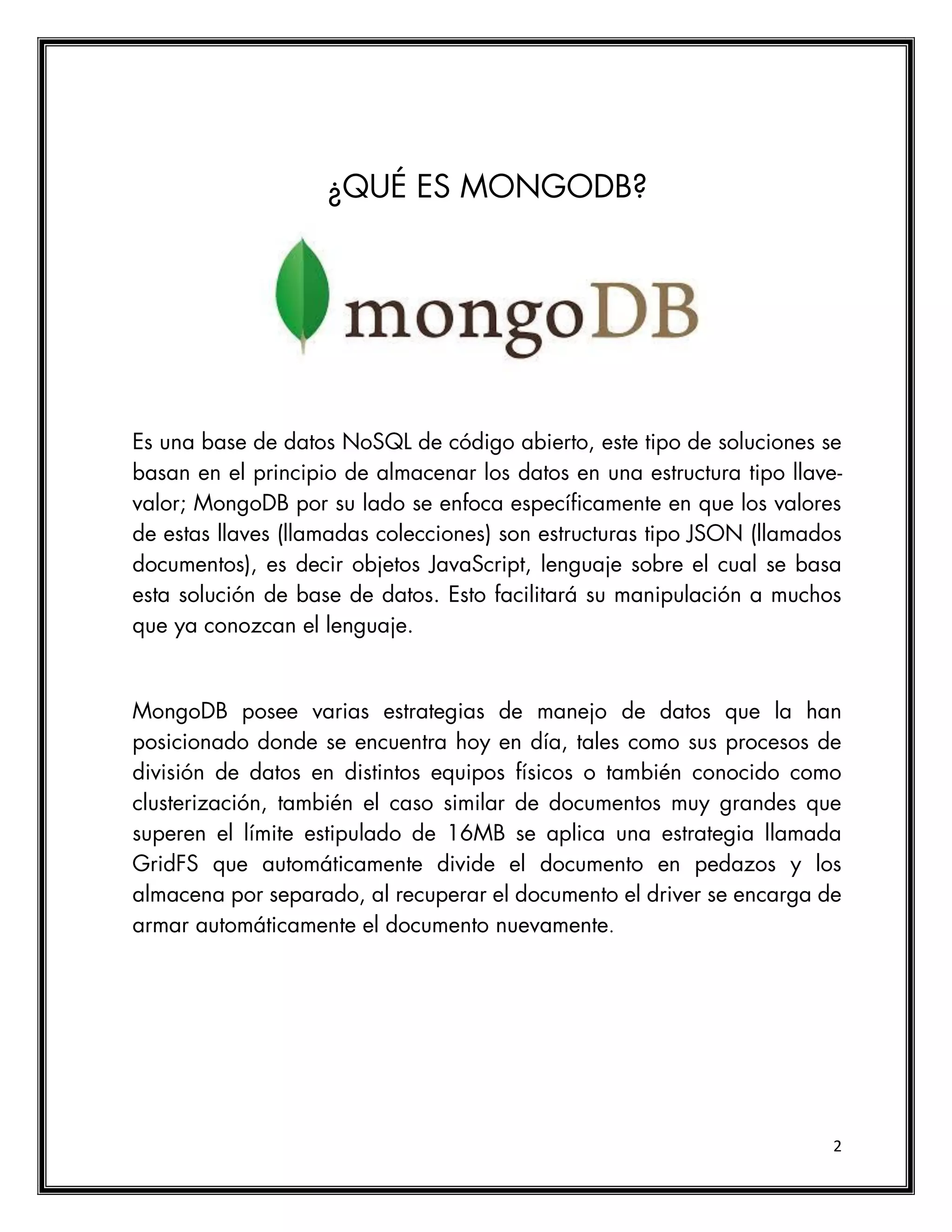 El documento proporciona instrucciones para instalar MongoDB. Explica que MongoDB es una base de datos NoSQL que almacena datos en formato JSON y describe los pasos para descargar e instalar MongoDB, incluyendo la creación de carpetas, ejecución de archivos mongod.exe y mongo.exe, y una prueba de conexión exitosa a la base de datos. También incluye un glosario de términos relacionados con la configuración de MongoDB.