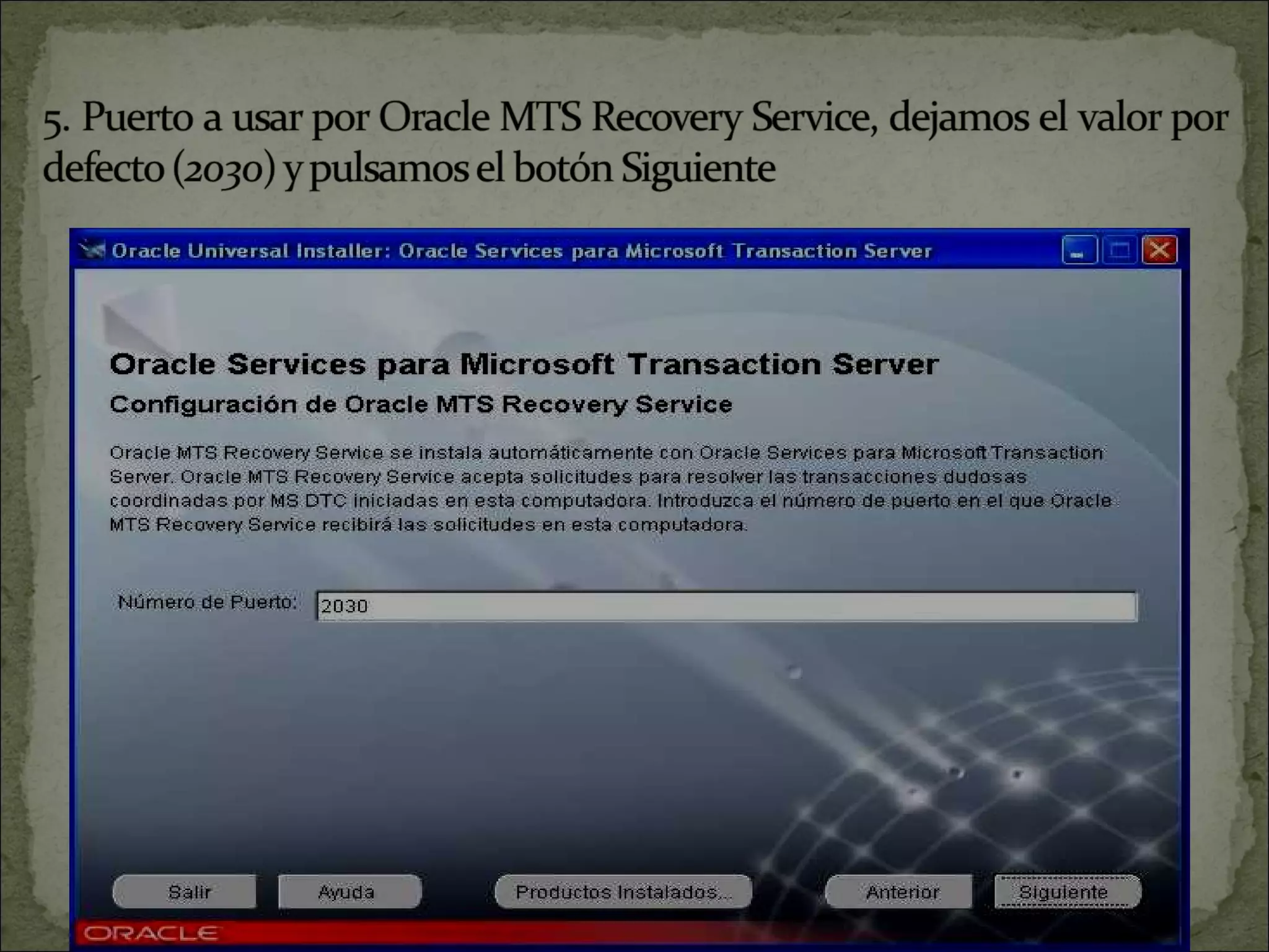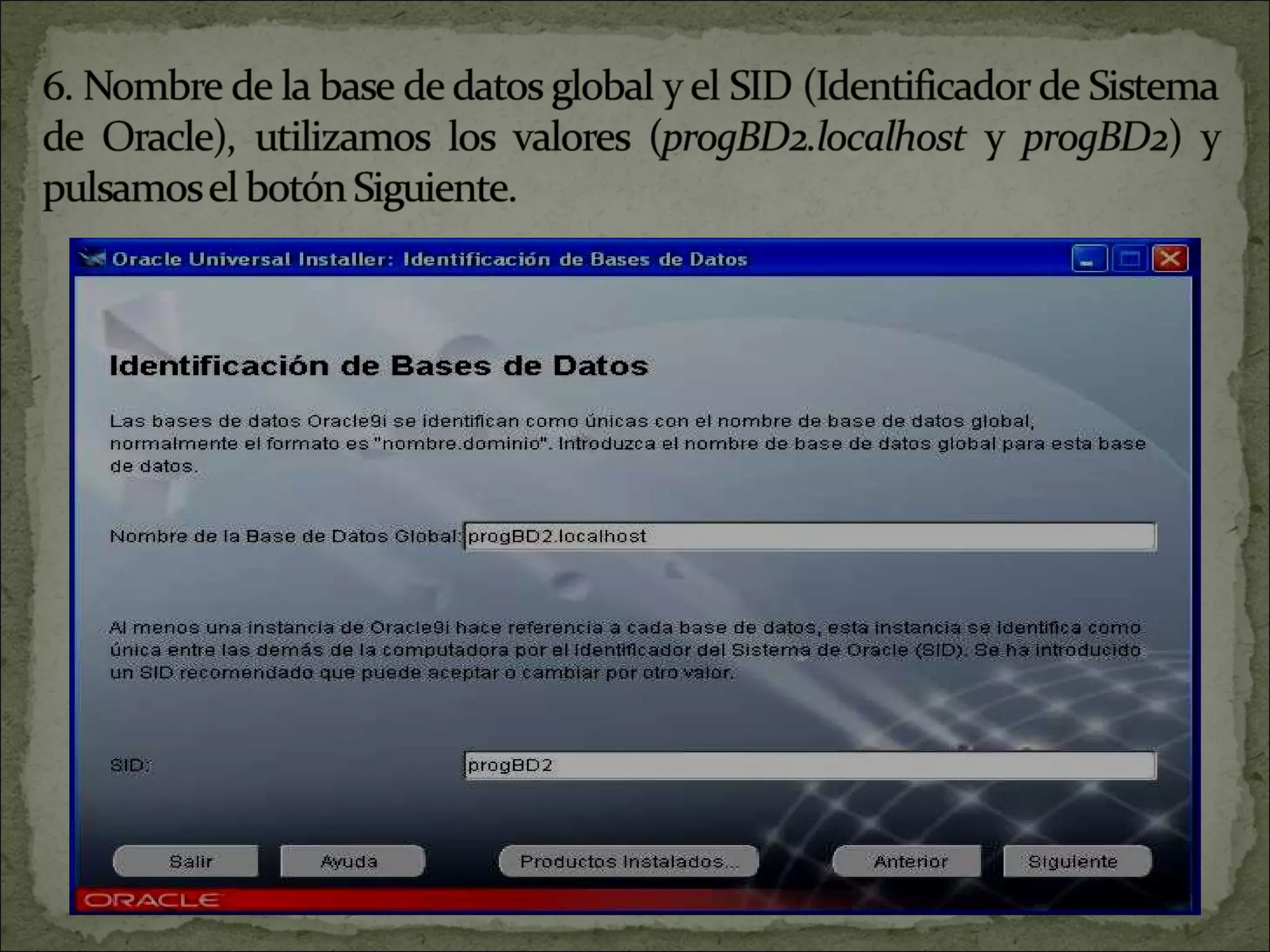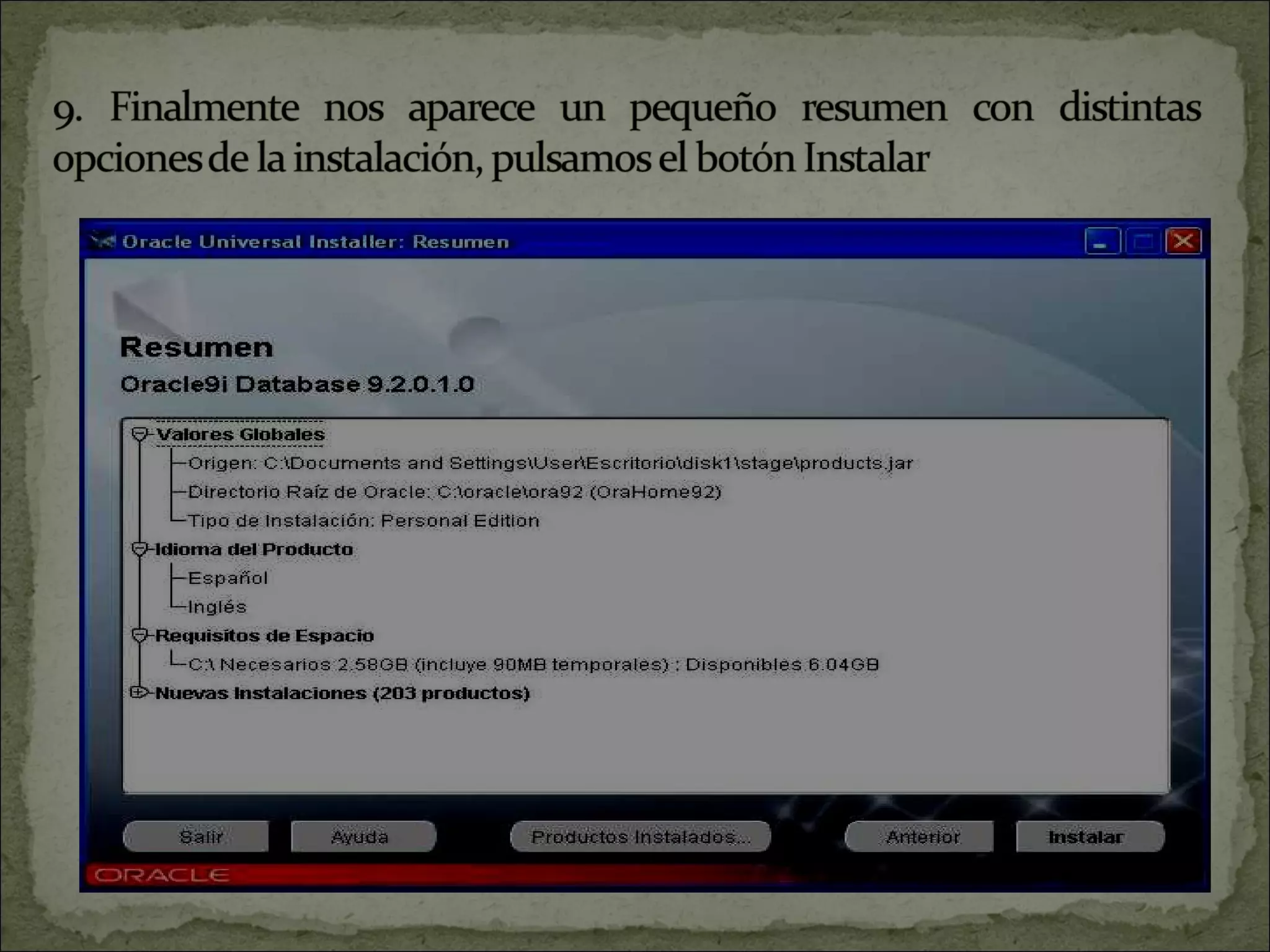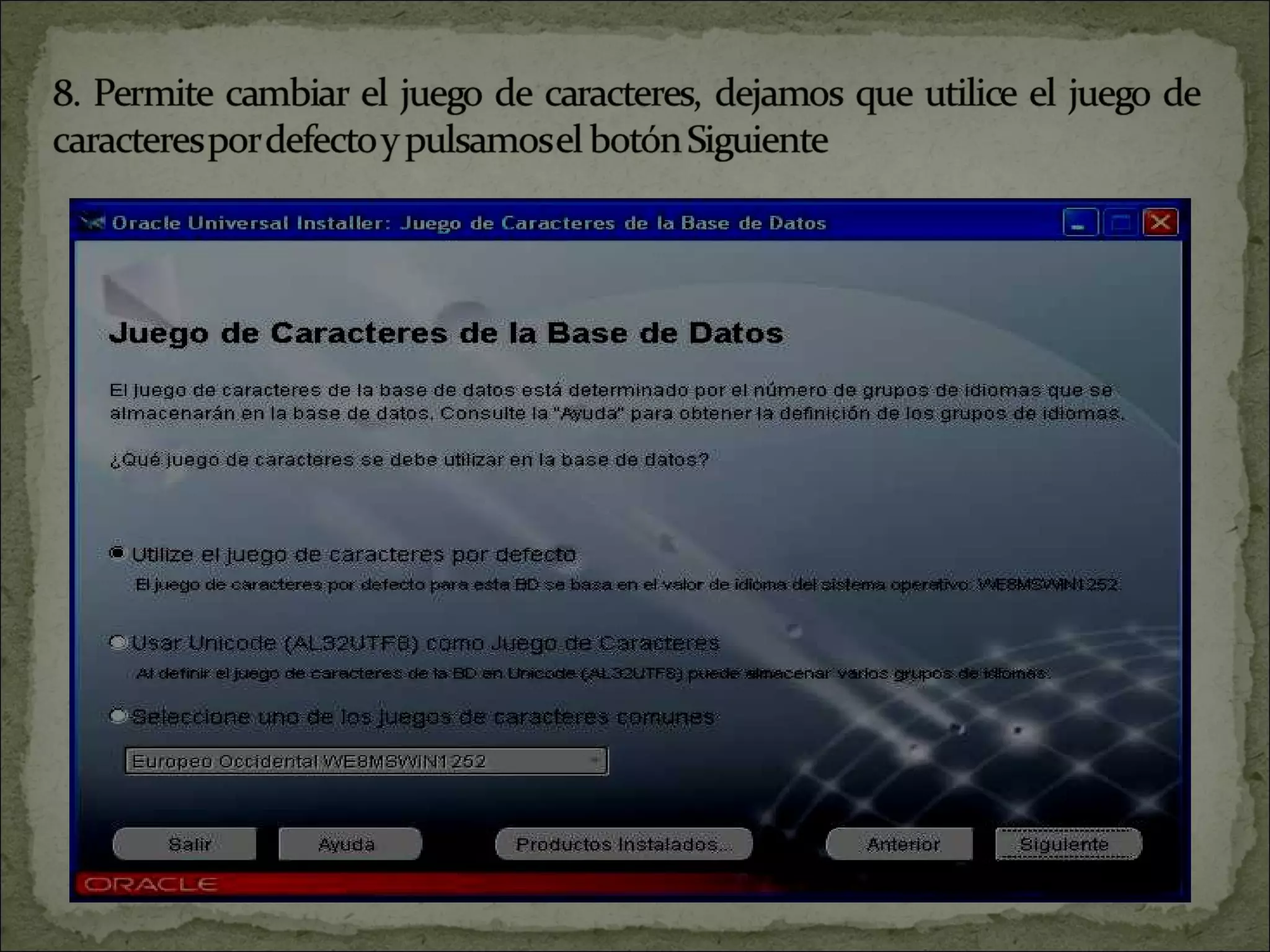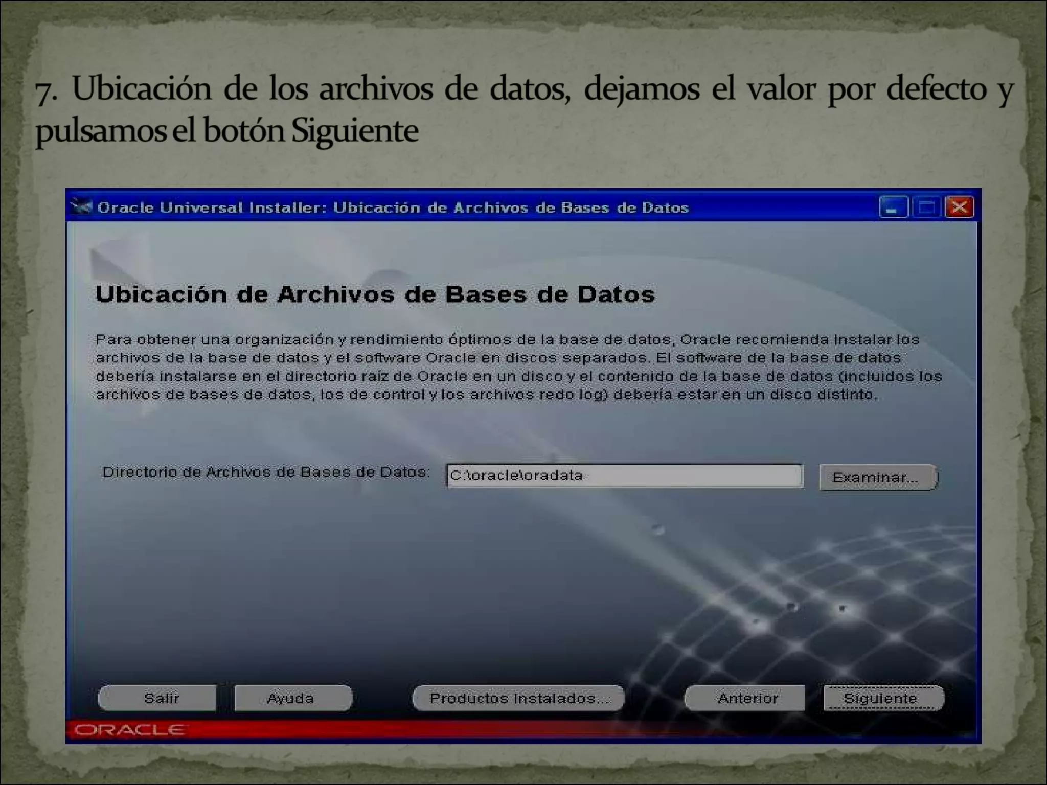 El documento describe los pasos para instalar Oracle, incluyendo seleccionar la ubicación de los archivos en el paso 2, seleccionar el tipo de configuración de la base de datos en el paso 4, y ver la pantalla de finalización exitosamente en el paso 11.
