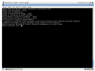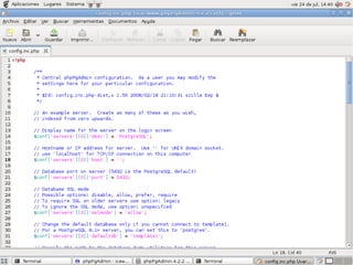 El documento describe los pasos para instalar y configurar PostgreSQL y phpPgAdmin en un servidor Linux. Incluye instrucciones para instalar PostgreSQL y phpPgAdmin, configurar la autenticación, el acceso remoto a la base de datos, y probar la conexión a través de phpPgAdmin.