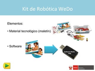 Este documento presenta una guía para la instalación del software WeDo y su integración en las áreas curriculares. Explica los componentes del kit de robótica WeDo, el software y los pasos para instalarlo en laptops XO. Además, detalla cómo la robótica educativa puede integrarse en ciencia, tecnología, matemática y comunicación para enseñar conceptos como mecanismos, programación, medición y comunicación oral y escrita.