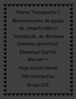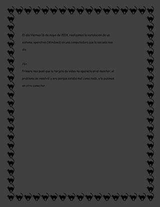 El documento describe la instalación de Windows en una computadora de la escuela. Primero hubo un problema con la tarjeta de video que no aparecía en el monitor, pero se resolvió al conectarla en otro puerto. Luego se detallan los pasos de la instalación, como encender la computadora e insertar el disco, seleccionar el idioma y zona horaria, crear un nombre de usuario y contraseña, y reiniciar para completar la instalación.