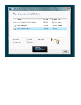 El documento proporciona instrucciones paso a paso para instalar Windows 8, incluyendo introducir el disco o USB de instalación, navegar por las pantallas de configuración, crear particiones en el disco duro, seleccionar opciones como el nombre del equipo y tipo de cuenta, y completar el proceso de instalación que concluye en la pantalla de inicio de Windows 8.