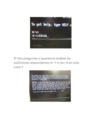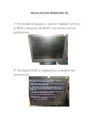Este documento proporciona instrucciones para instalar Windows 98 en una computadora. Explica los pasos de particionar el disco duro para crear dos particiones del 50% cada una, formatear la partición C:, instalar Windows 98 desde el CD y completar el proceso de instalación seleccionando opciones típicas y los componentes recomendados.