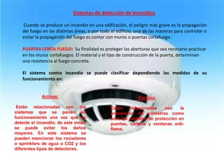 El documento describe diferentes sistemas de detección y extinción de incendios. Menciona sistemas de detección activos y pasivos, así como convencionales, analógicos e inteligentes. También describe componentes comunes como detectores y centrales de alarma, así como métodos de extinción como rociadores de agua, espuma y extintores manuales y en aerosol.
