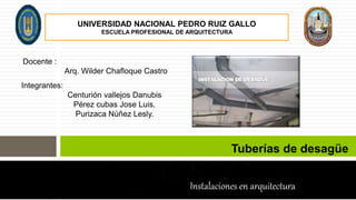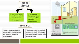 El documento describe los componentes y métodos de instalación de un sistema de desagüe, incluyendo tuberías de PVC, accesorios como codos y uniones, la importancia de la pendiente, la ubicación de registros y trampas, y los pasos del proceso de instalación. Explica que las tuberías de desagüe actuales se hacen de PVC, son livianas y duraderas, y se unen usando empalmes de espiga y campana con cemento.