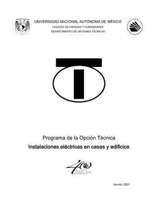 Este documento presenta el programa académico de la Opción Técnica de Instalaciones Eléctricas en Casas y Edificios de la Universidad Nacional Autónoma de México. El programa busca preparar a los estudiantes para realizar instalaciones eléctricas de baja tensión en espacios habitacionales y comerciales. Consta de cinco unidades temáticas y 120 horas de clase impartidas durante dos semestres. El objetivo es que los estudiantes adquieran los conocimientos y habilidades necesarias para desempeñarse como técn