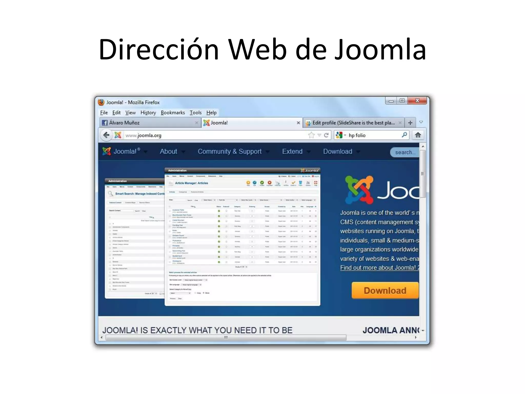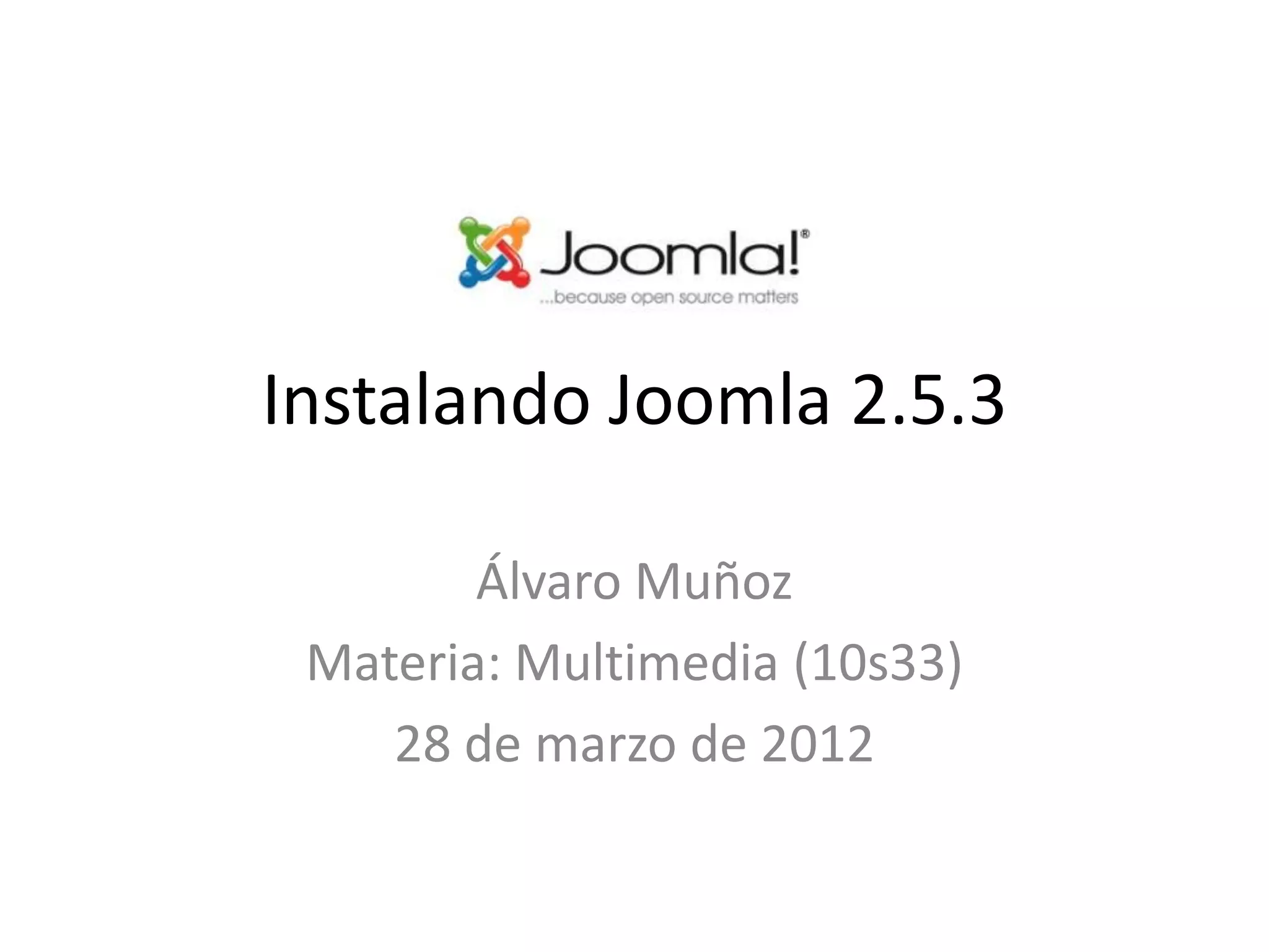 El documento describe los pasos para instalar Joomla 2.5.3 en un servidor, incluyendo descargar e instalar el software, crear una base de datos, completar el proceso de instalación, y verificar que el sitio web funciona correctamente en el navegador y en el panel de administración.