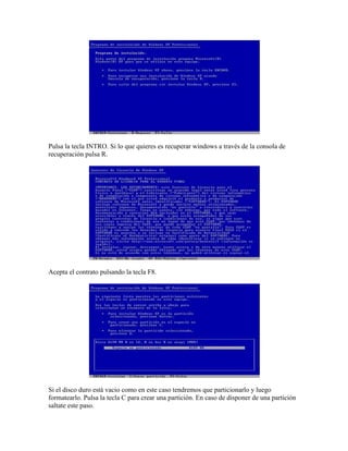 Este documento proporciona instrucciones paso a paso para instalar Windows XP, incluyendo insertar el CD de instalación, particionar y formatear el disco duro, configurar la fecha, hora y zona horaria, conectar a Internet, e instalar actualizaciones y programas. Una vez completada la instalación, se muestra el escritorio de Windows listo para su uso.