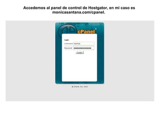 Este documento proporciona instrucciones en 3 pasos para instalar WordPress en Hostgator usando QuickInstall: 1) Acceder al panel de control de Hostgator y buscar QuickInstall, 2) Seleccionar WordPress en QuickInstall, 3) Completar la instalación proporcionando información básica como el correo electrónico, título y descripción del blog.