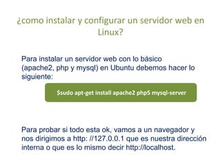 Este documento explica cómo instalar y configurar un servidor web básico en Ubuntu con Apache2, PHP y MySQL. Primero se instalan los paquetes necesarios con apt-get y luego se crea un archivo PHP de prueba en el directorio predeterminado de Apache para verificar que PHP funciona correctamente en el servidor web.