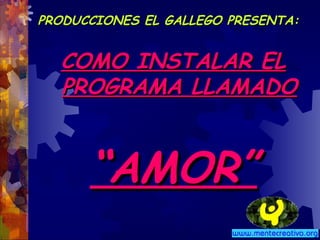 Este documento describe cómo instalar el "programa" llamado AMOR. El asistente guía al cliente a través de los pasos de instalación, que incluyen borrar programas como DOLORPASADO.EXE y RESETIRMENTO.COM. Una vez instalado, AMOR llena el "corazón" del cliente con archivos como SONRISA.MPG y FELICIDAD.COM. Finalmente, el asistente aconseja al cliente que comparta AMOR con otros.