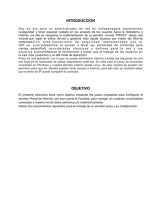 Este documento proporciona instrucciones para configurar un servidor proxy. Explica qué es un servidor proxy, los diferentes tipos, cómo instalar uno, los requisitos del sistema y los pasos para configurar el servidor y los clientes. Incluye una sección de práctica guiando al lector a través de la instalación de un servidor proxy en una red local con tres computadoras.