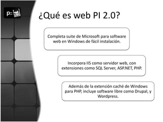 Web PI es una herramienta de Microsoft que facilita la instalación de PHP, Drupal y otras aplicaciones web en Windows. El documento explica cómo descargar e instalar Web PI, las secciones principales que incluye para instalar servidores web, frameworks, bases de datos y aplicaciones, y concluye indicando que en una próxima parte mostrará cómo instalar Drupal con Web PI en Windows 7.