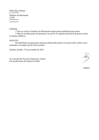El documento es una solicitud al concejal de urbanismo para habilitar un parque para mascotas en Sanlúcar de Barrameda, ya que actualmente no existe ningún parque habilitado para perros y el solicitante ha recibido quejas de personas por la presencia de perros sueltos en parques públicos.