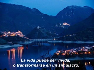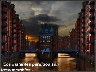 Este documento explora la naturaleza efímera de la vida y la insatisfacción humana a través de las citas de Rabindranath Tagore y observaciones sobre cómo las personas pierden el tiempo buscando lo que no tienen en lugar de disfrutar el presente. Alienta al lector a vivir el momento, disfrutar de lo que se tiene y no perder más tiempo pensando que es demasiado tarde.