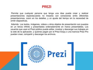 Prezi es una herramienta de presentación no lineal que permite crear presentaciones interactivas colocando texto, imágenes y videos en un lienzo infinito. A diferencia de PowerPoint que usa diapositivas fijas, Prezi utiliza zoom y giros para navegar por el contenido. PowerPoint es un programa de escritorio mientras que Prezi es una aplicación en línea.