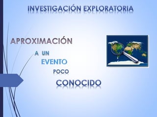 Este documento presenta los detalles de una investigación exploratoria realizada por Jenny Martínez para su quinto semestre en la Universidad Central del Ecuador. La investigación utilizó métodos cualitativos como entrevistas y registros para explorar un tema general y formular preguntas de investigación más precisas. El objetivo de este tipo de investigación exploratoria es proporcionar conocimiento preliminar sobre un problema y establecer las bases para investigaciones posteriores más completas.