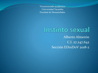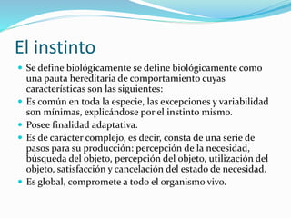 El documento discute diferentes perspectivas sobre el instinto y la sexualidad humana. Examina las definiciones biológicas del instinto y argumenta que los humanos carecen de instintos complejos, aunque tienen mecanismos más simples. También analiza las teorías de que existen instintos de supervivencia, reproducción y religioso en los humanos, así como las teorías de Freud sobre pulsiones en lugar de instintos. Además, define la sexualidad humana y sus dimensiones biológica, psicológica y social, así como los concept