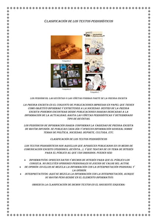 Este documento clasifica y describe los diferentes tipos de textos periodísticos. Identifica tres tipos principales de textos: informativos, de opinión e interpretativos. Explica que los textos periodísticos tienen la función de informar sobre hechos y temas de interés general para el público, aunque también pueden incluir valoraciones y opiniones. Además, describe las características de la comunicación periodística, incluyendo que se dirige a amplios grupos de lectores y utiliza códigos lingüísticos y extralingüísticos.