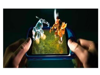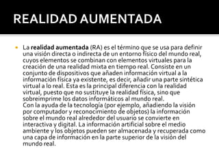La realidad aumentada combina elementos virtuales con el mundo real en tiempo real usando dispositivos como pantallas en la cabeza o en la mano. Estos dispositivos superponen información digital como imágenes o texto sobre lo que el usuario está viendo. La realidad aumentada se está aplicando cada vez más en educación, cirugía, deportes y otros campos.