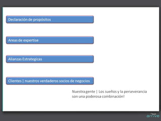 Arrive RRHH es una consultora que se especializa en el desarrollo humano y organizacional. Ofrece servicios de consultoría, capacitación y evaluación de necesidades de personal para ayudar a las empresas a maximizar el potencial de sus empleados. El objetivo es implementar modelos más individualizados que se enfoquen en las necesidades únicas de cada persona.