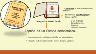 Este documento describe la organización política y territorial de España. Explica que España es una monarquía parlamentaria con un rey como jefe de estado y un primer ministro elegido. Detalla las diferentes instituciones del gobierno a nivel nacional y regional, incluyendo el congreso, el senado, los tribunales y las comunidades autónomas.