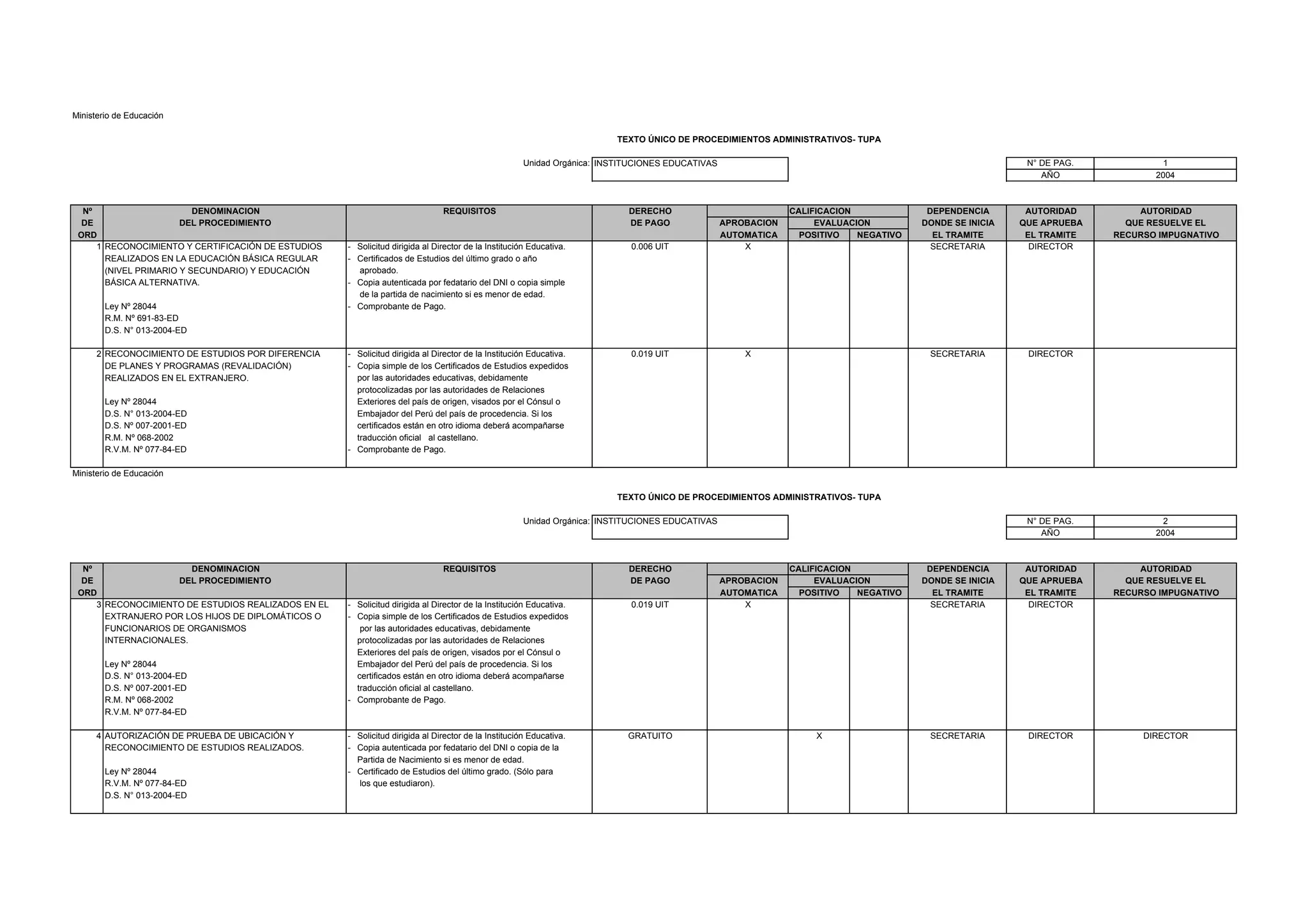 Este documento presenta 10 procedimientos administrativos de instituciones educativas peruanas. Los procedimientos incluyen el reconocimiento y certificación de estudios, reconocimiento de estudios realizados en el extranjero, convalidación de estudios, evaluación de asignaturas, expedición de certificados y diplomas, entre otros. Para cada procedimiento se especifican los requisitos, derechos de pago, dependencia donde inicia el trámite y autoridad que aprueba o resuelve recursos. El documento provee información sobre trámites administrativos