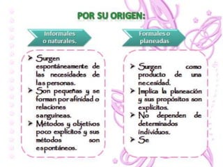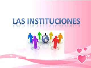 Este documento presenta una lista de integrantes de un curso de administración en trabajo social e información sobre las instituciones sociales. Describe las características, tipos y funciones de las instituciones, incluyendo instituciones con fines sociales, económicas, culturales, políticas, recreativas y religiosas.