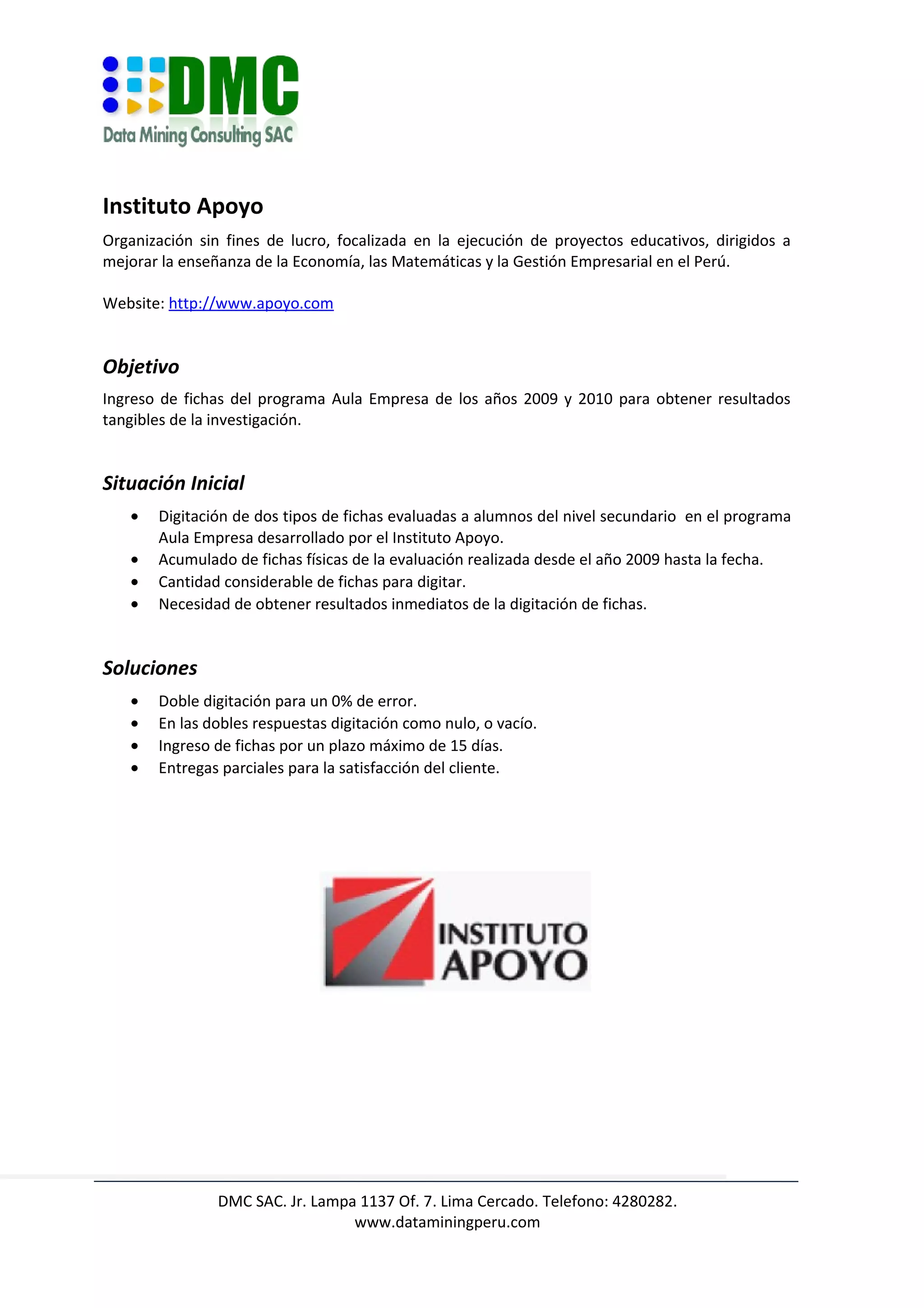 El documento describe un proyecto para digitalizar fichas de evaluación de un programa educativo llamado Aula Empresa del Instituto Apoyo. El proyecto requiere la digitalización de fichas físicas acumuladas desde 2009 para obtener resultados de investigación de manera más rápida. La solución propuesta incluye una doble digitación para evitar errores y entregas parciales en un plazo máximo de 15 días.