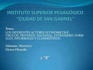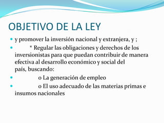 El documento describe los objetivos y regulaciones de la ley de inversión ecuatoriana. Busca promover la inversión nacional y extranjera para generar empleos, usar recursos nacionales, aumentar exportaciones, y fomentar el desarrollo económico. Declara que la inversión en sectores productivos y de servicios es una prioridad nacional. Detalla que la inversión extranjera directa puede efectuarse en todos los sectores sin autorización previa, excepto en áreas estratégicas del estado. Además, los inversionistas