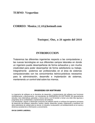 Este documento describe varias ingenierías relacionadas con las computadoras e informática. Explica brevemente los campos laborales de un ingeniero en software, ingeniero en administración y servicios TI, e ingeniero en arquitectura de computadoras. También resume las funciones de un ingeniero en software de base, ingeniero en programación, e ingeniero en tratamiento de la información. Concluye que los ingenieros tienen la capacidad de analizar, diseñar y aplicar nuevas tecnologías para mejorar la vida de las personas y que existen muchas oportunidades laborales