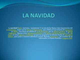 El documento habla sobre la Navidad. Explica que la Navidad celebra el nacimiento de Jesucristo el 25 de diciembre y señala que es una de las fiestas más importantes del cristianismo junto con la Pascua y Pentecostés. También menciona que la fecha del 25 de diciembre fue establecida por la Iglesia en el siglo III y que existen diferentes términos para referirse a la Navidad en distintos idiomas como Christmas en inglés o Weihnachten en alemán.