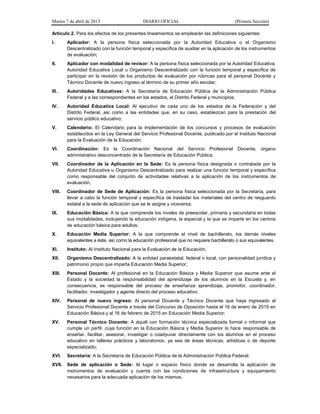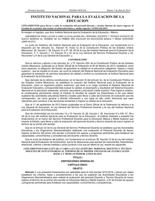 Este documento establece lineamientos para la evaluación del personal docente y técnico docente de nuevo ingreso al término de su primer año escolar en educación básica y media superior. Define los criterios, fases y procedimientos que deben seguir las autoridades educativas para realizar esta evaluación con fines de diagnóstico y mejora continua. Además, especifica los elementos a considerar en la evaluación de la práctica docente y las responsabilidades de las diferentes instituciones involucradas en el proceso.
