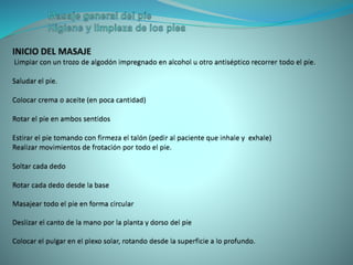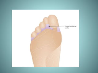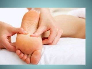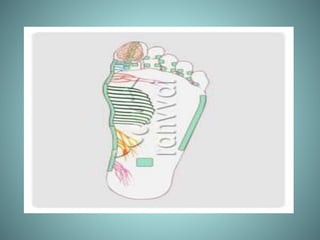 Este documento ofrece una introducción a la reflexología, explicando su origen histórico, sus beneficios para la salud, cómo funciona, las zonas reflejas del pie y los pasos básicos para realizar un auto-tratamiento o sesión de reflexología.