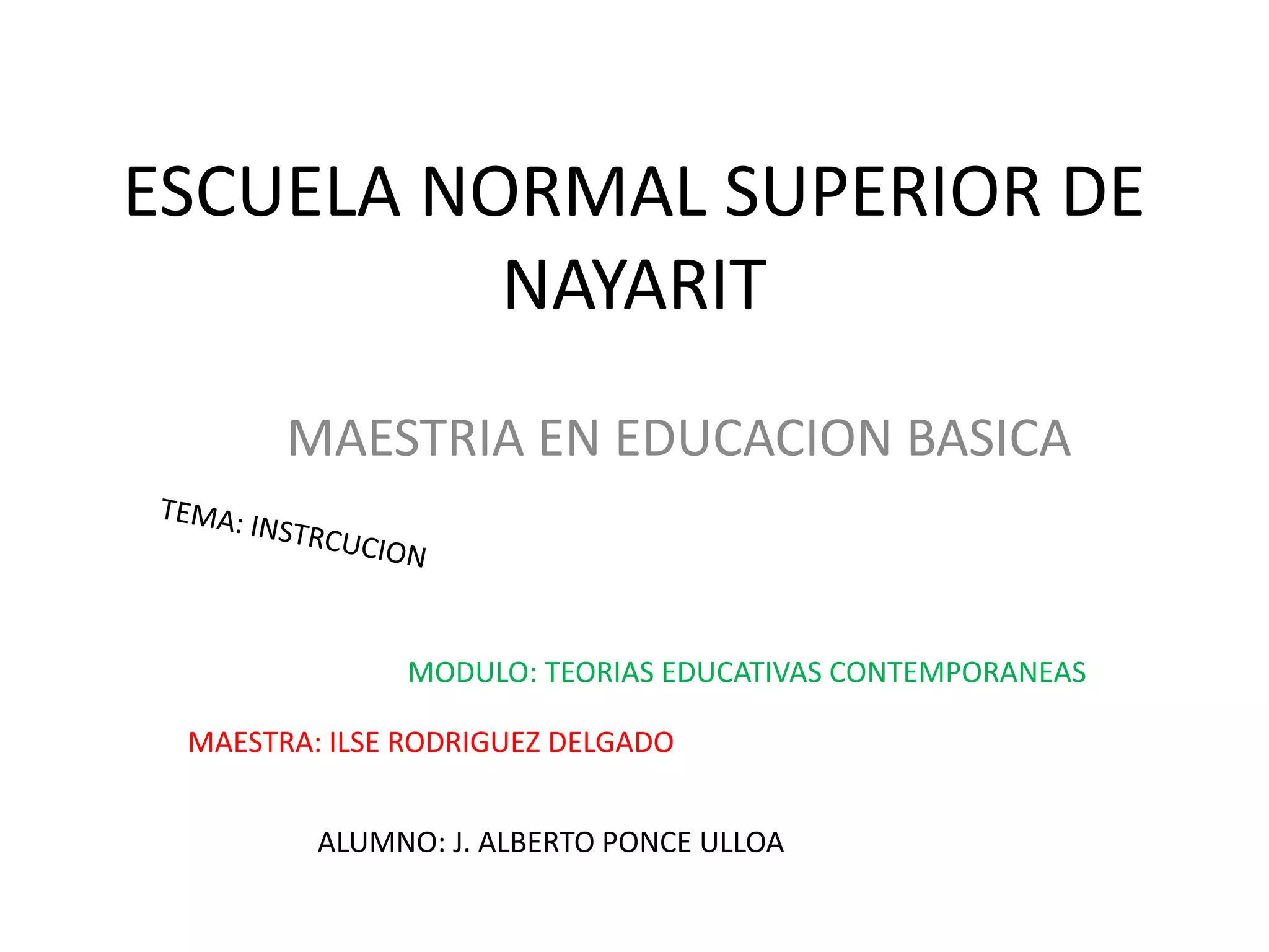 Este documento trata sobre la instrucción en educación. Define la instrucción como la adquisición de conocimientos a través de cualquier medio y para cualquier propósito. Explica que la instrucción puede darse de forma deportiva, educativa, militar, artesanal o a través de consejos u órdenes. También describe diferentes tipos de instrucción en educación como indirecta, interactiva, independiente y directa. Finalmente, concluye que la instrucción complementa a la educación al generar cambios en los conocimientos generales y que avanza con las neces