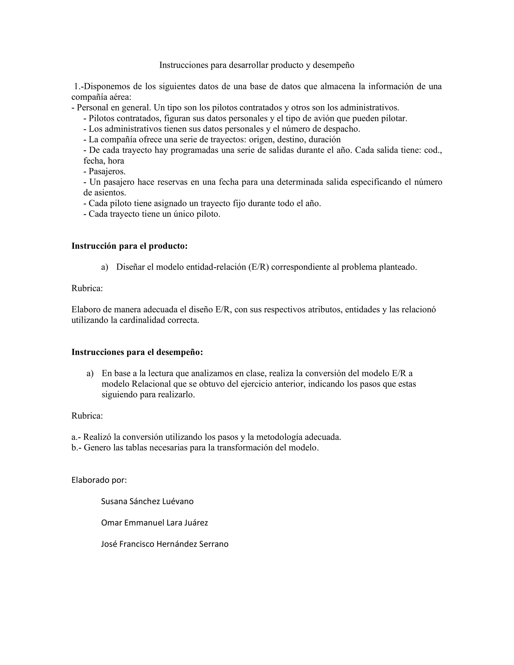 Este documento presenta instrucciones para desarrollar un modelo entidad-relación y su conversión a un modelo relacional para una base de datos de una compañía aérea. Se proporcionan los datos relevantes sobre pilotos, administrativos, trayectos, salidas y pasajeros. Se pide diseñar un modelo E/R y luego convertirlo a un modelo relacional siguiendo los pasos correctos. Se evalúa la precisión del modelo E/R y los pasos seguidos en la conversión.