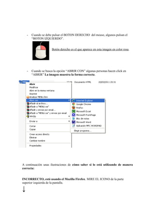 Este documento proporciona instrucciones para ejecutar un CD en computadoras Windows de 32 bits utilizando el navegador Internet Explorer. Explica que el CD solo funciona con Internet Explorer y que los usuarios deben abrir el archivo MENU del CD seleccionando la opción "Abrir con" e indicando a Internet Explorer como programa predeterminado. También identifica errores comunes como pulsar el botón izquierdo en lugar del derecho o seleccionar "Abrir" en lugar de "Abrir con".
