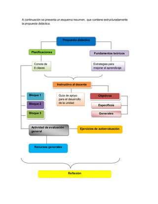 El documento presenta una propuesta didáctica para la enseñanza de la historia de Chile entre 1970-1988. La propuesta contiene 3 bloques principales: 1) Introducción a la democracia y dictadura militar, 2) Desarrollo del gobierno de Allende, la dictadura militar y el retorno a la democracia, y 3) Conclusión enfocada en los derechos humanos. Cada bloque incluye objetivos, contenidos, actividades y evaluaciones. La propuesta utiliza diversos recursos como mapas conceptuales, líneas