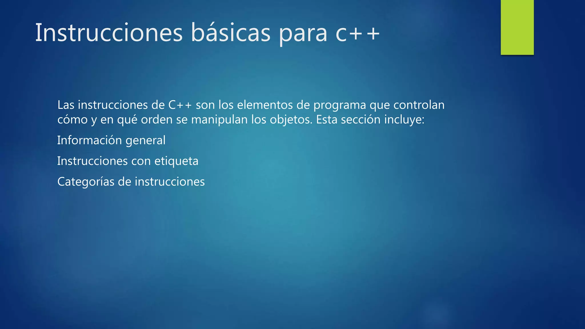 Este documento resume las diferentes categorías de instrucciones en C++. Incluye instrucciones declarativas para declarar variables y constantes, instrucciones de asignación para dar valores a variables, instrucciones selectivas como if/else para ejecutar código condicionalmente, instrucciones repetitivas como for loops para repetir código, e instrucciones de entrada y salida para ingresar y mostrar datos. Además, cubre instrucciones de expresión, nulas, compuestas y de bifurcación.