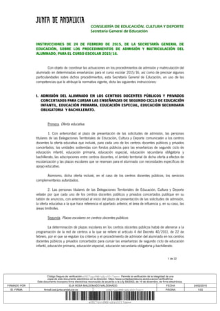 Este documento establece instrucciones sobre los procedimientos de admisión y matriculación del alumnado para el curso escolar 2015/16 en Andalucía. Detalla los procedimientos para determinar la oferta educativa y número de plazas en centros públicos y privados concertados, así como para modificar el número de unidades autorizadas cuando sea necesario. También especifica los requisitos para informar sobre el alumnado matriculado.