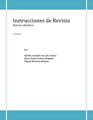 El documento proporciona instrucciones para crear una revista tecnológica en Word en 20 cuartillas o más. Debe incluir elementos de formato como bordes de página, color, fuentes, columnas e imágenes. También se deben incluir artículos originales sobre tecnología y publicar la revista en línea. Será evaluada según criterios de desarrollo creativo, estructura y contenido original.