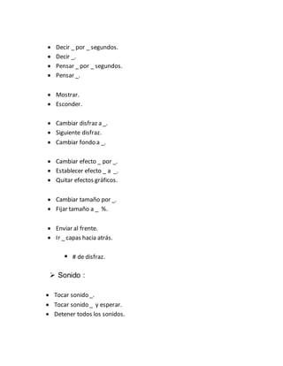Este documento proporciona instrucciones para el uso de bloques en Scratch, incluyendo bloques para movimiento, apariencia, sonido, lápiz, datos, eventos, control, sensores y operadores. Ofrece una lista detallada de bloques para realizar diferentes acciones como mover, girar, cambiar disfraces y fondos, tocar sonidos, controlar el lápiz, crear variables y listas, detectar eventos y sensores, y realizar operaciones matemáticas.